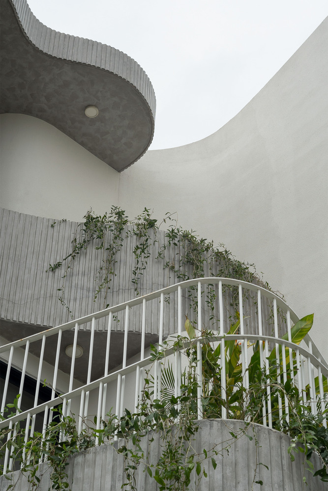 Curved language & spatial experience – Curved forms are applied consistently across balustrades, arches, wall surfaces, ceilings, and the façade to soften sharp edges and establish a cohesive architectural language. Beyond safety considerations, these curves directly influence how occupants move through and interact with the space. Rounded surfaces allow circulation to flow smoothly, reducing abrupt directional changes and helping users intuitively perceive boundaries between functional zones. Visually, curves soften transitions between spaces, mitigating the sense of fragmentation often found in townhouses. By rounding corners, light and sightlines are drawn deeper into the interior, enhancing the perception of spaciousness and comfort.